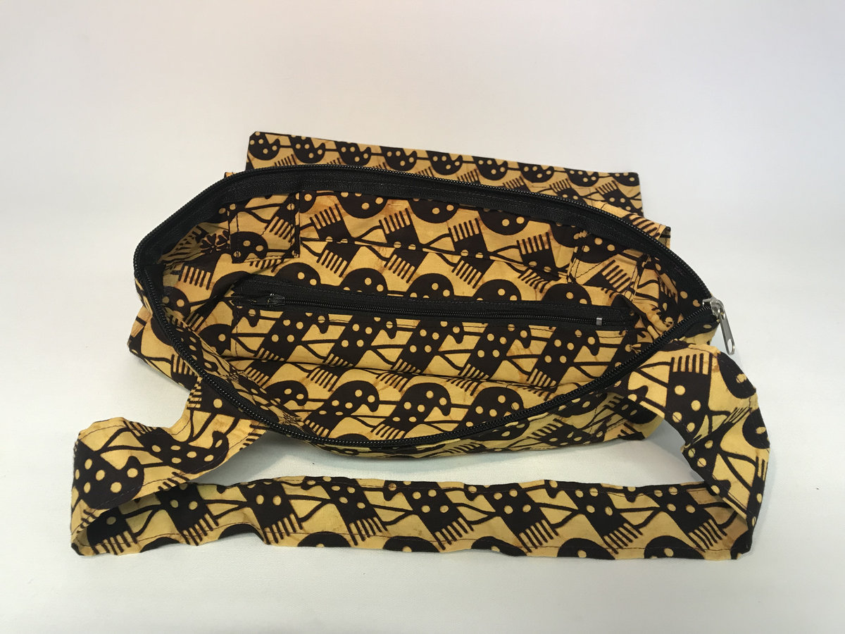 Handmade bag of original Ugandan Kitenge fabric, 100% cotton, bags close with zipper on top, plus extra zipper pocket inside, made in Kampala / Uganda.